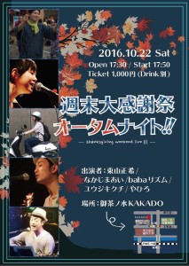 『週末大感謝祭オータムナイト!!』 10/22(土) @御茶ノ水KAKADO open 17:30/start 17:50 ticket ¥1000(D別) 出演者:東山正希/babaリズム/なかじまあい/ユウジキクチ/やひろ [...]