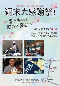 週末大感謝祭! ~春よ来い!歌の大宴会~ 3/19(SUN) @阿佐ヶ谷 Next Sunday open 12:40 /start 13:00 1,000(drink別) 出演 : ユウジキクチ/東山正希/babaリズム/やひろ DJ: ライ・S・アンダーソン 日曜日のお昼から、お酒 [...]
