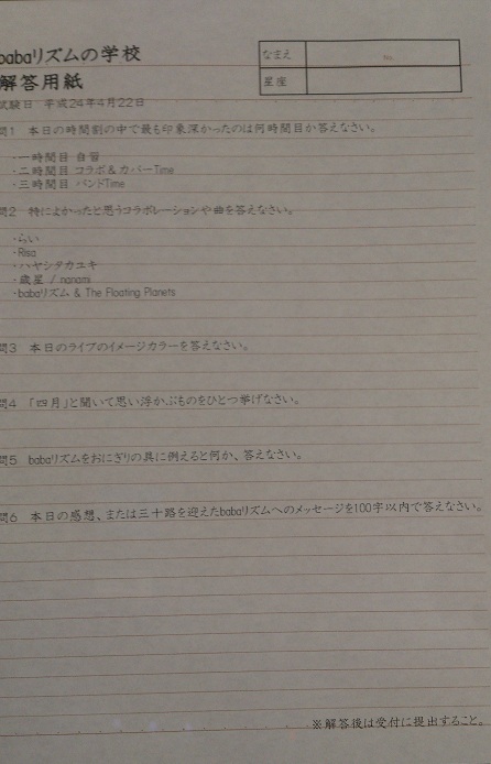 今回は『babaリズムの学校』になぞらえて「解答用紙」というテスト形式です。