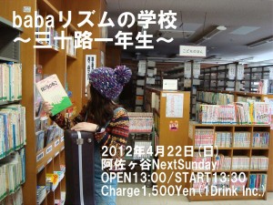 初企画ワンマンライブ 『babaリズムの学校~三十路一年生~』 2012年4月22日(日曜日) 場所 : 阿佐ヶ谷 Next Sunday 時間 : open 13:00 / start 13:30 (終演予定 15:30) 料金 : 前売り・当日共に 1,500円(1ドリンク込) 一 [...]